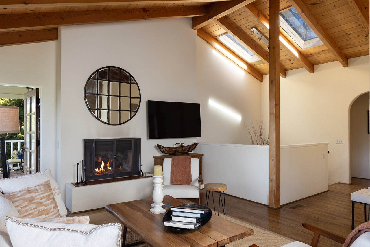 Welcome to this exquisitely remodeled Carmel-by-the-Sea retreat, offering breathtaking Fish Ranch views and nestled in a serene, private setting among majestic oaks. Set on a rare, expansive ½+ acre lot just blocks from downtown Carmel, this elegant home seamlessly blends luxury and tranquility. The upper-level main living area is bathed in natural light, with vaulted open-beam ceilings, solid hardwood floors, and expansive picture windows. The open-concept gourmet kitchen boasts a stunning Crema Marfil marble island, Thermador and Bosch appliances, and French doors that open to peaceful verandas overlooking lush, drought-tolerant landscaping.