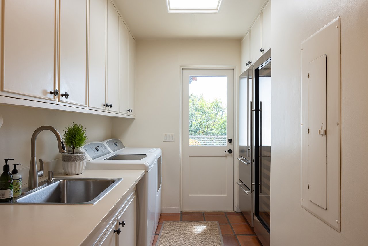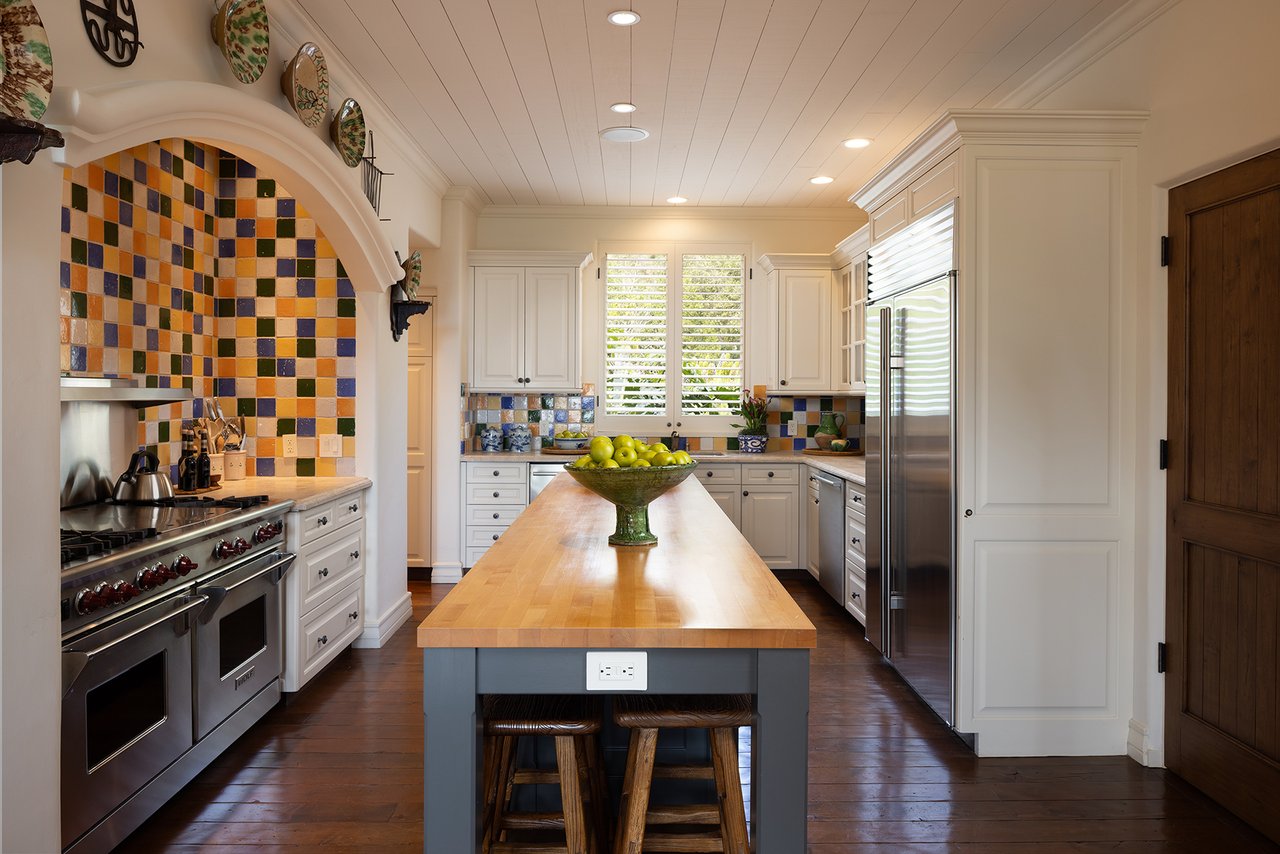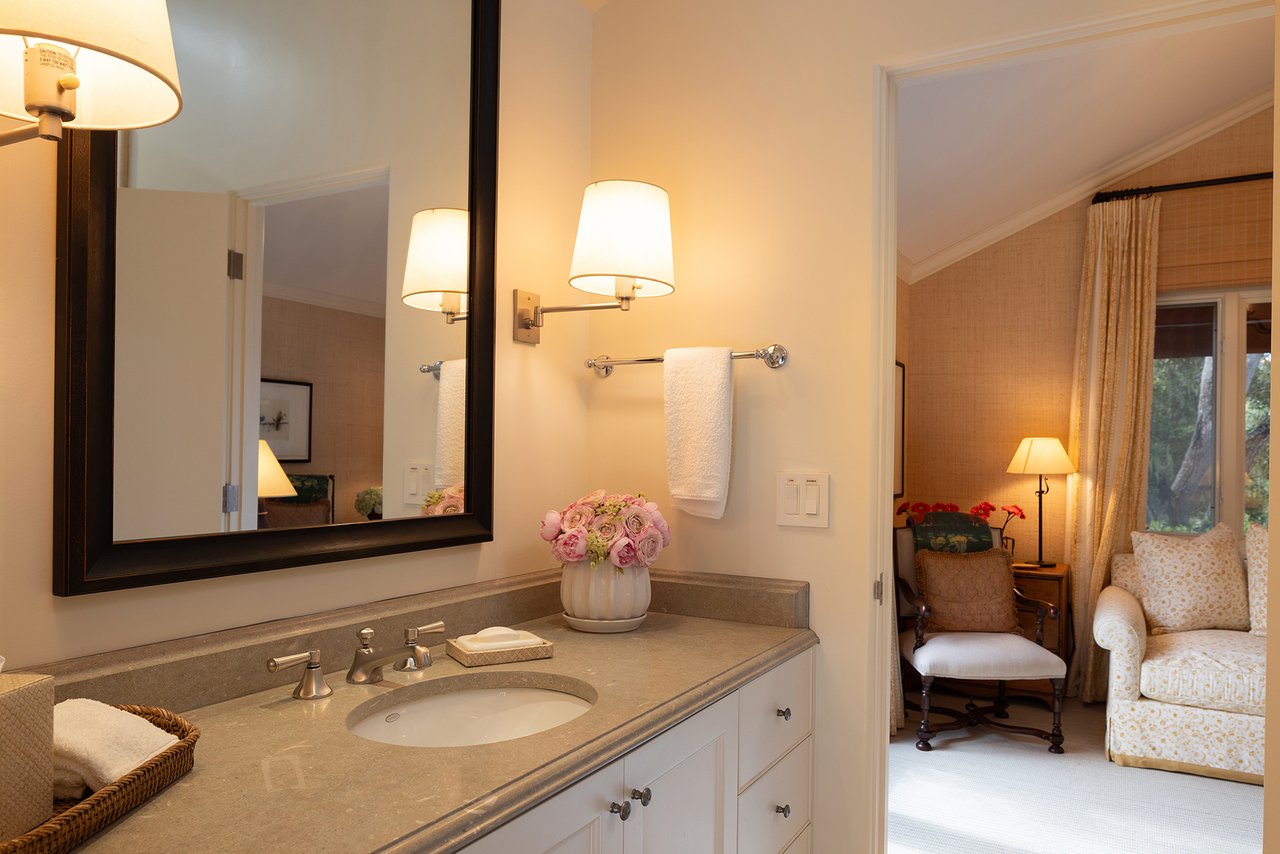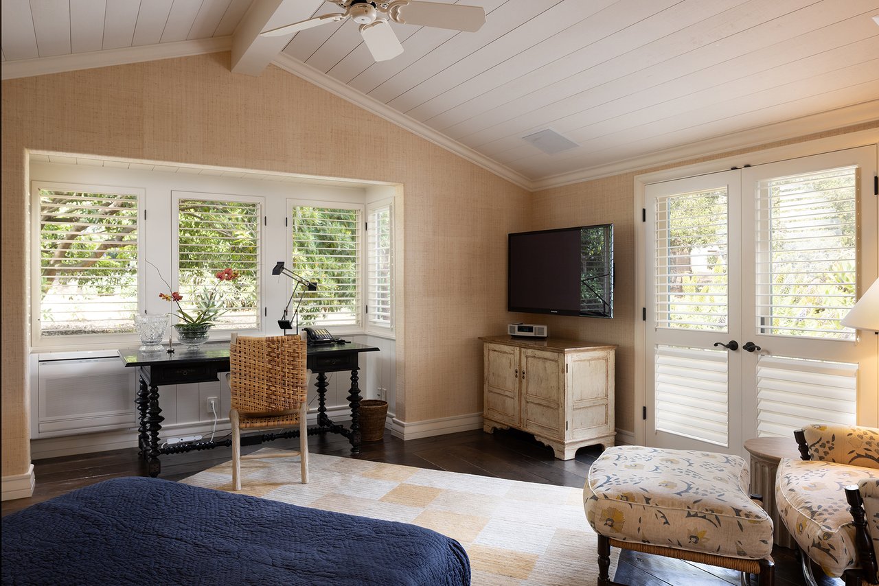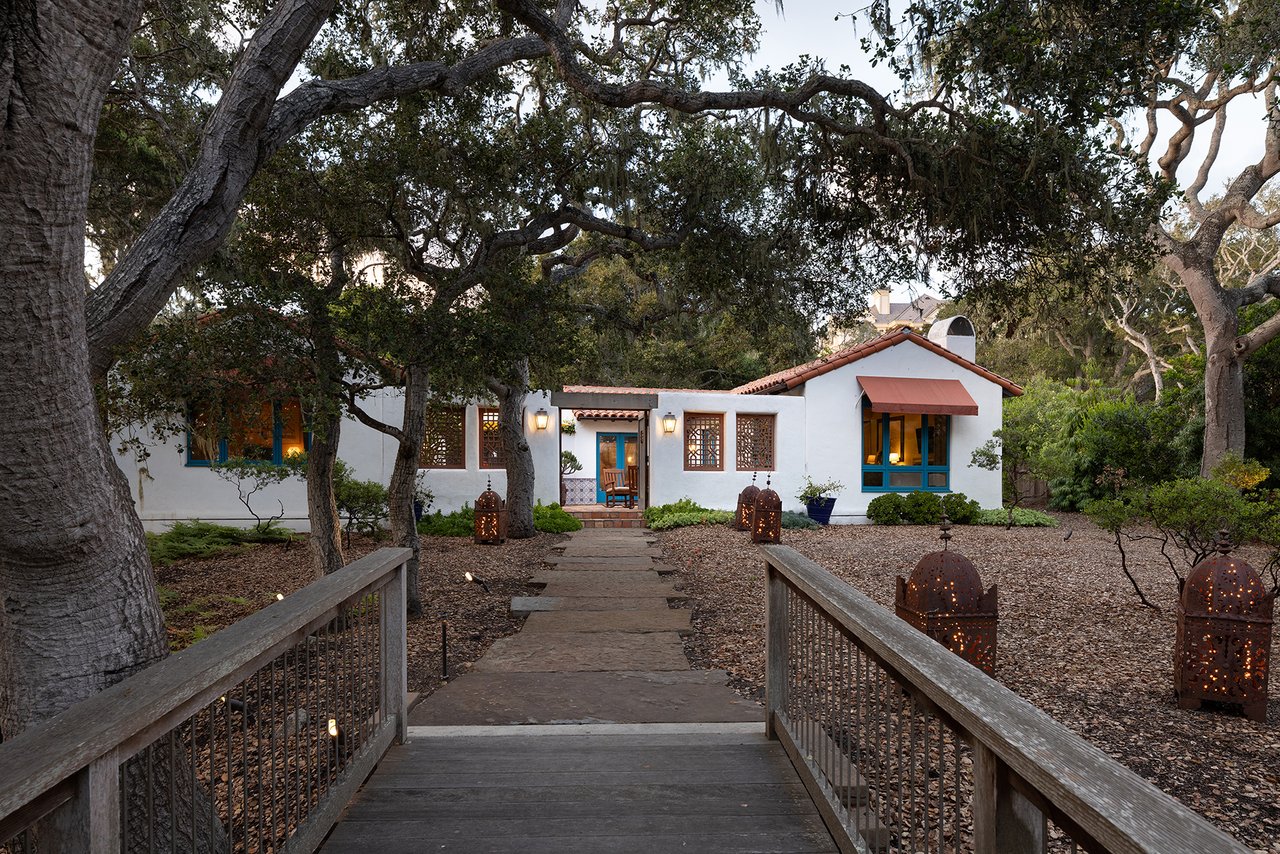 The beautifully manicured grounds include expansive parking, charming shell paths, and mature landscaping with distinctive monkey puzzle trees. A picturesque bridge over a seasonal stream leads to a private detached ADU with a kitchen, living room, vaulted wood ceilings, and a fireplace, along with two guest bedrooms and a shared bath across a courtyard.