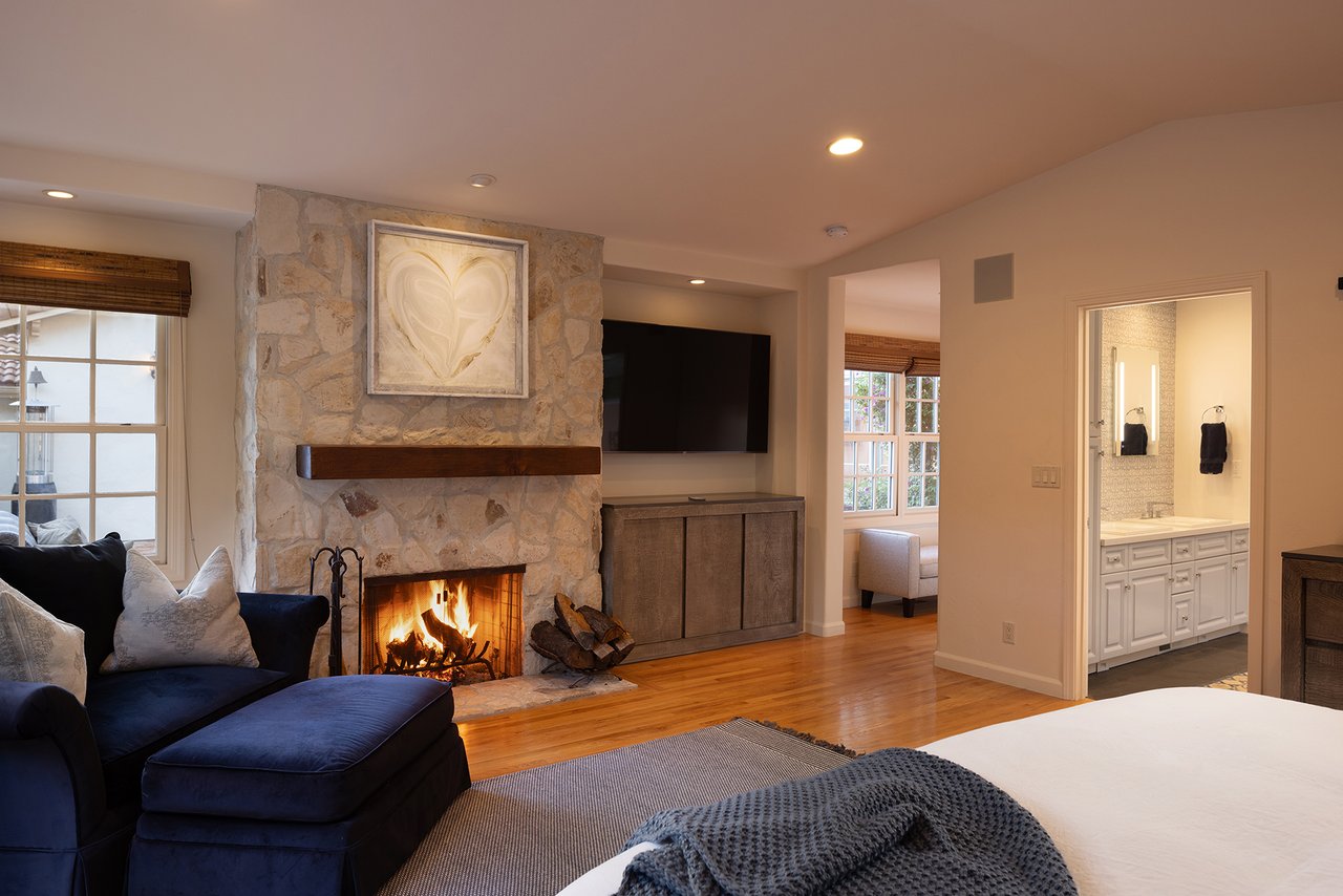 The home features four bedrooms and three and one-half baths, with interiors finished in a thoughtful blend of tile and wood that feels grounded and timeless. Five fireplaces, including three wood-burning and two gas, anchor the living spaces and add warmth and character throughout. The floor plan flows comfortably for everyday living while scaling naturally for entertaining.