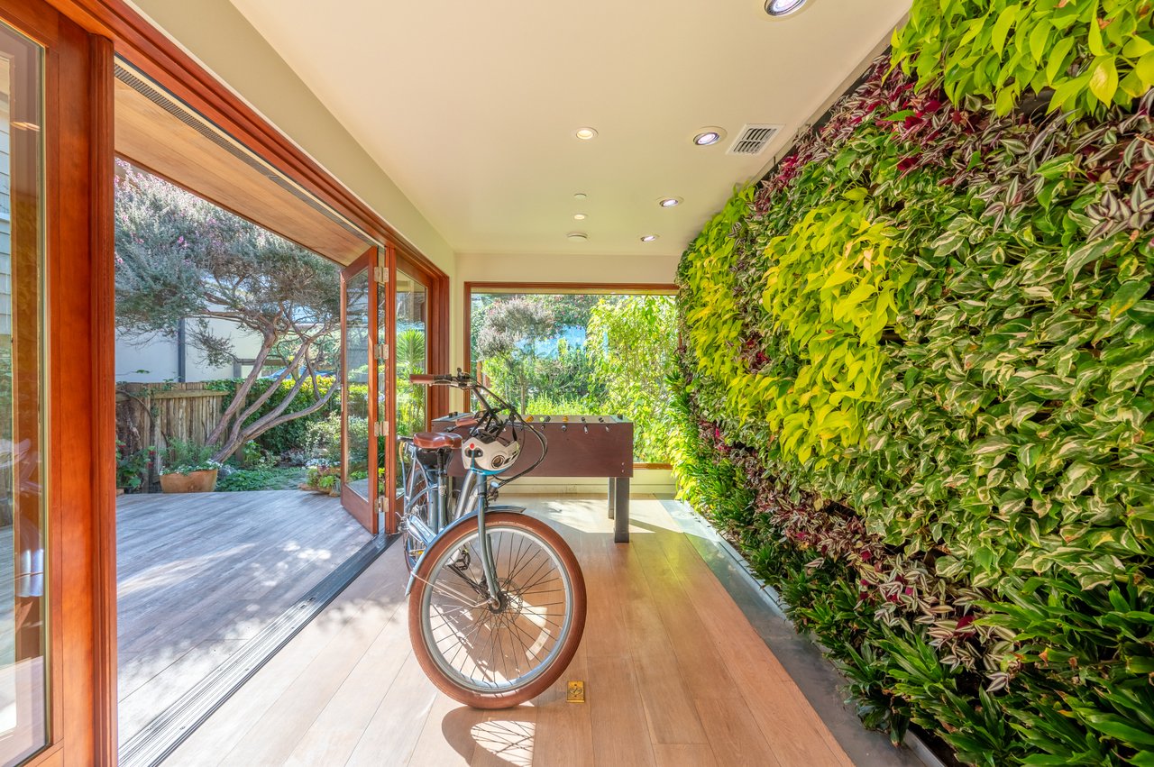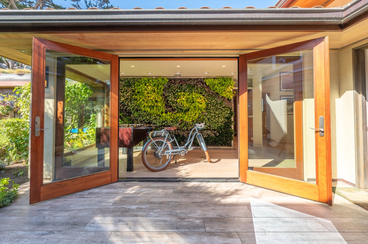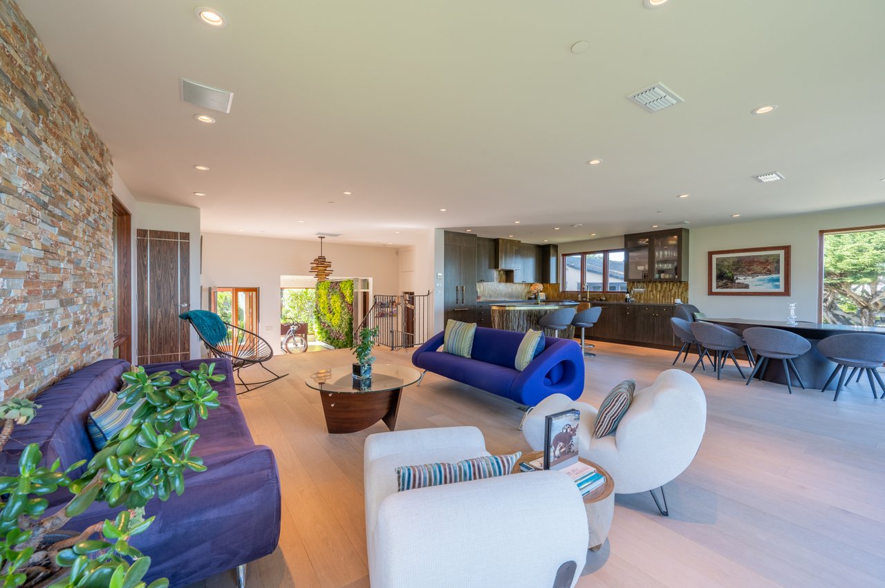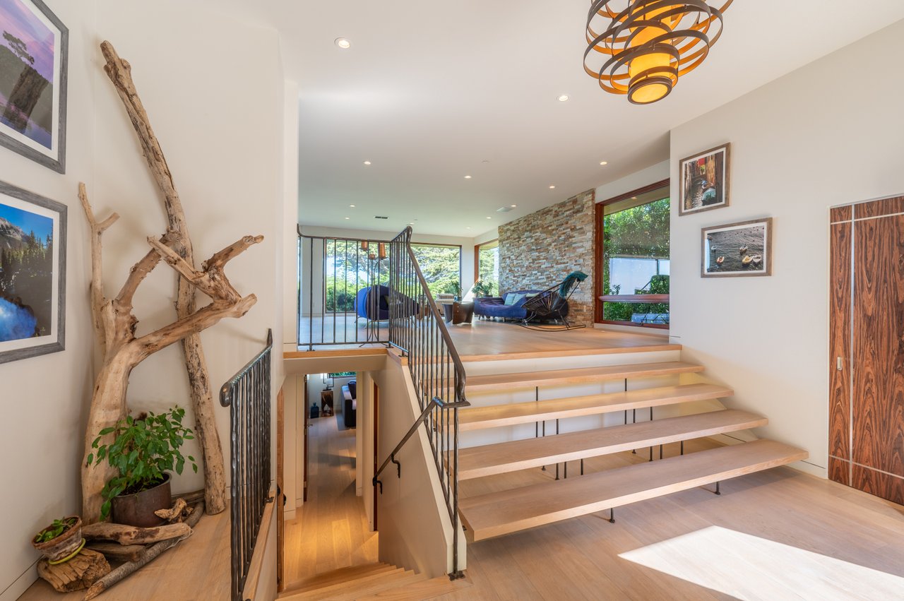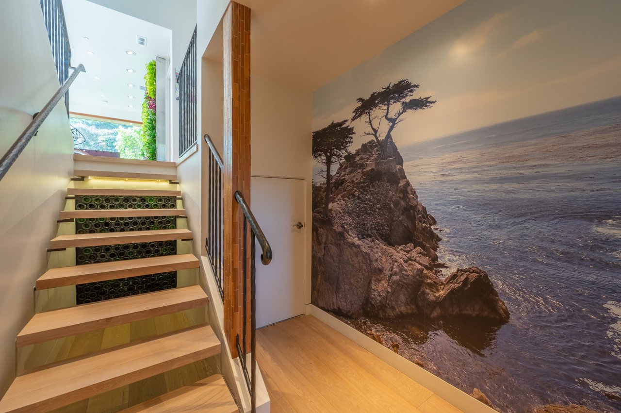 Located on coveted Carmel Point, just one block from both of Carmel’s world-famous beaches, this beautifully remodeled Green Point Rated luxury rental has gorgeous views stretching from Carmel Bay to Pebble Beach and is a Net Zero Energy home with carbon-neutral and sustainable features. Huge windows bring the outdoors inside with the living room area boasting fabulous sand and whitewater views. Other highlights include 3 bedrooms, 3 bathrooms, a custom metal and glass front door, indoor living wall designed with plants in different textures, shapes and colors to highlight the spiral pattern complementing the wave motif on the front door, a well-appointed kitchen, natural wine cellar, and custom metalwork throughout.
