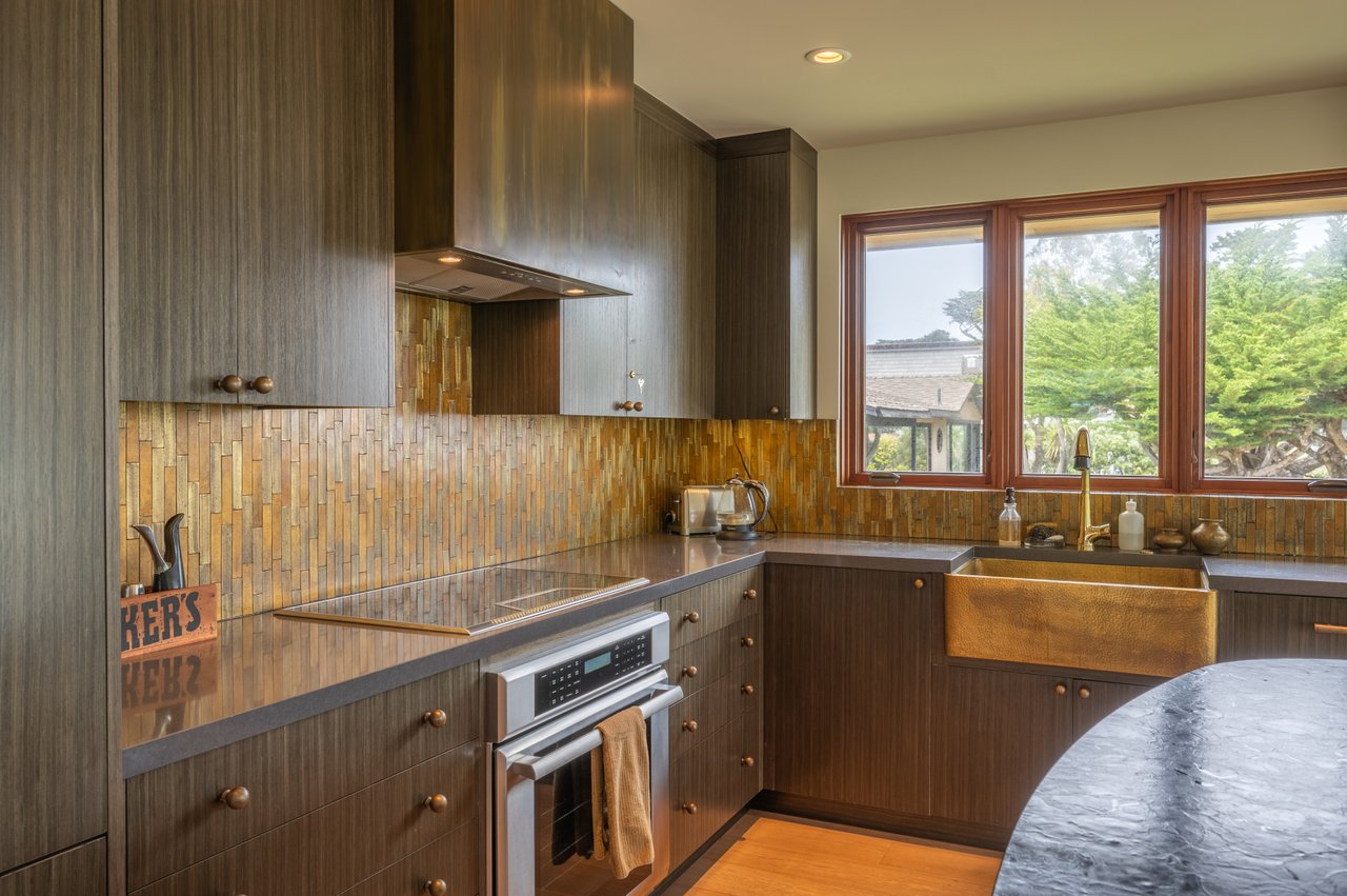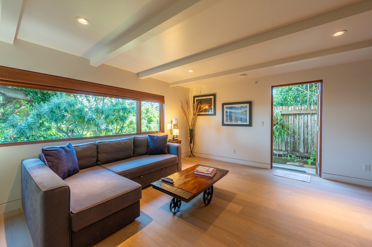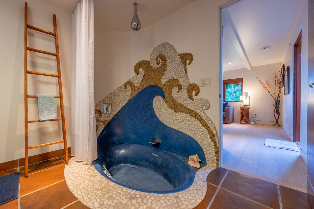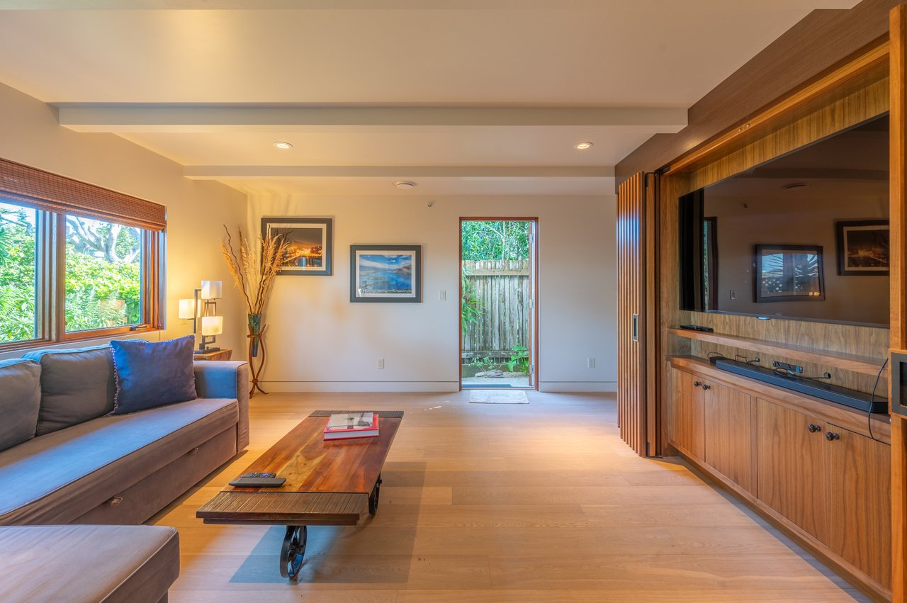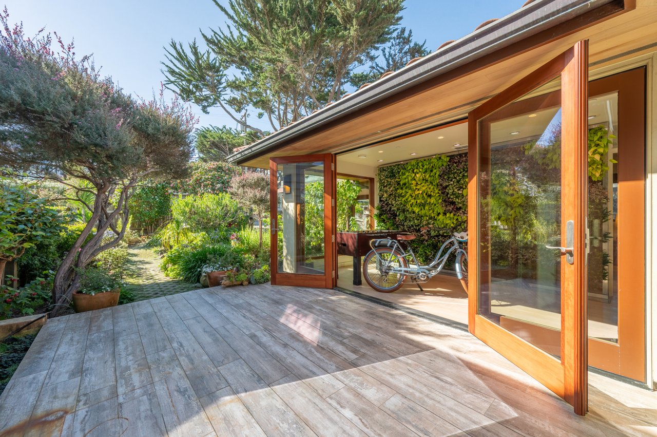 Located on coveted Carmel Point, just one block from both of Carmel’s world-famous beaches, this beautifully remodeled Green Point Rated luxury rental has gorgeous views stretching from Carmel Bay to Pebble Beach and is a Net Zero Energy home with carbon-neutral and sustainable features. Huge windows bring the outdoors inside with the living room area boasting fabulous sand and whitewater views. Other highlights include 3 bedrooms, 3 bathrooms, a custom metal and glass front door, indoor living wall designed with plants in different textures, shapes and colors to highlight the spiral pattern complementing the wave motif on the front door, a well-appointed kitchen, natural wine cellar, and custom metalwork throughout.