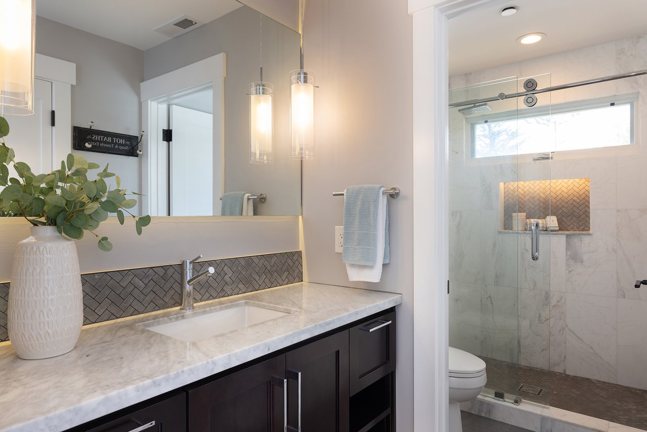 The chef’s kitchen is equipped with Calcutta marble and Caesarstone countertops, a Bertazzoni stove and hood and a large island with bar seating, flowing seamlessly into the dining area and living room with a striking stone gas fireplace. Custom lighting enhances every space. The main-level primary suite includes a spa-like bath with a skylit shower, his and her sinks, and direct access to the fenced backyard. A convenient half bath is also on the main level.