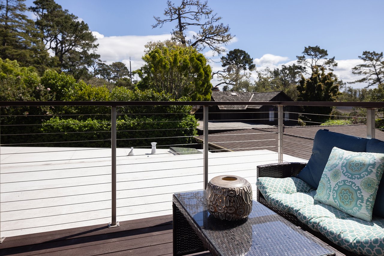 Upstairs, two bright bedrooms share a beautifully appointed full bath, with one offering a private balcony, plus an additional spacious balcony for outdoor enjoyment. The front yard features a welcoming sitting area with a fire pit, perfect for relaxing evenings. Complete with a 1-car attached garage, this turnkey home blends luxury, comfort, and ideal Carmel living.