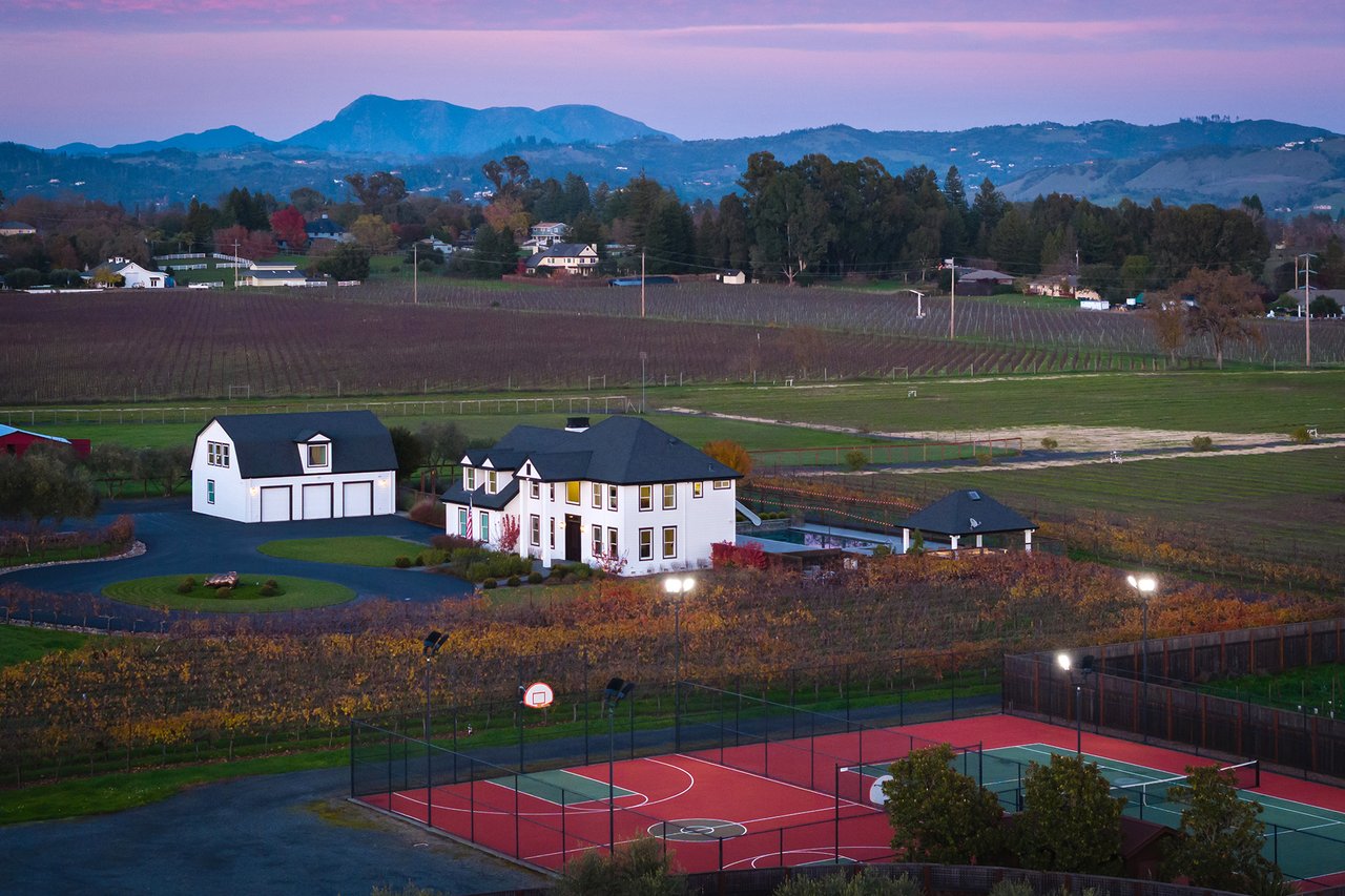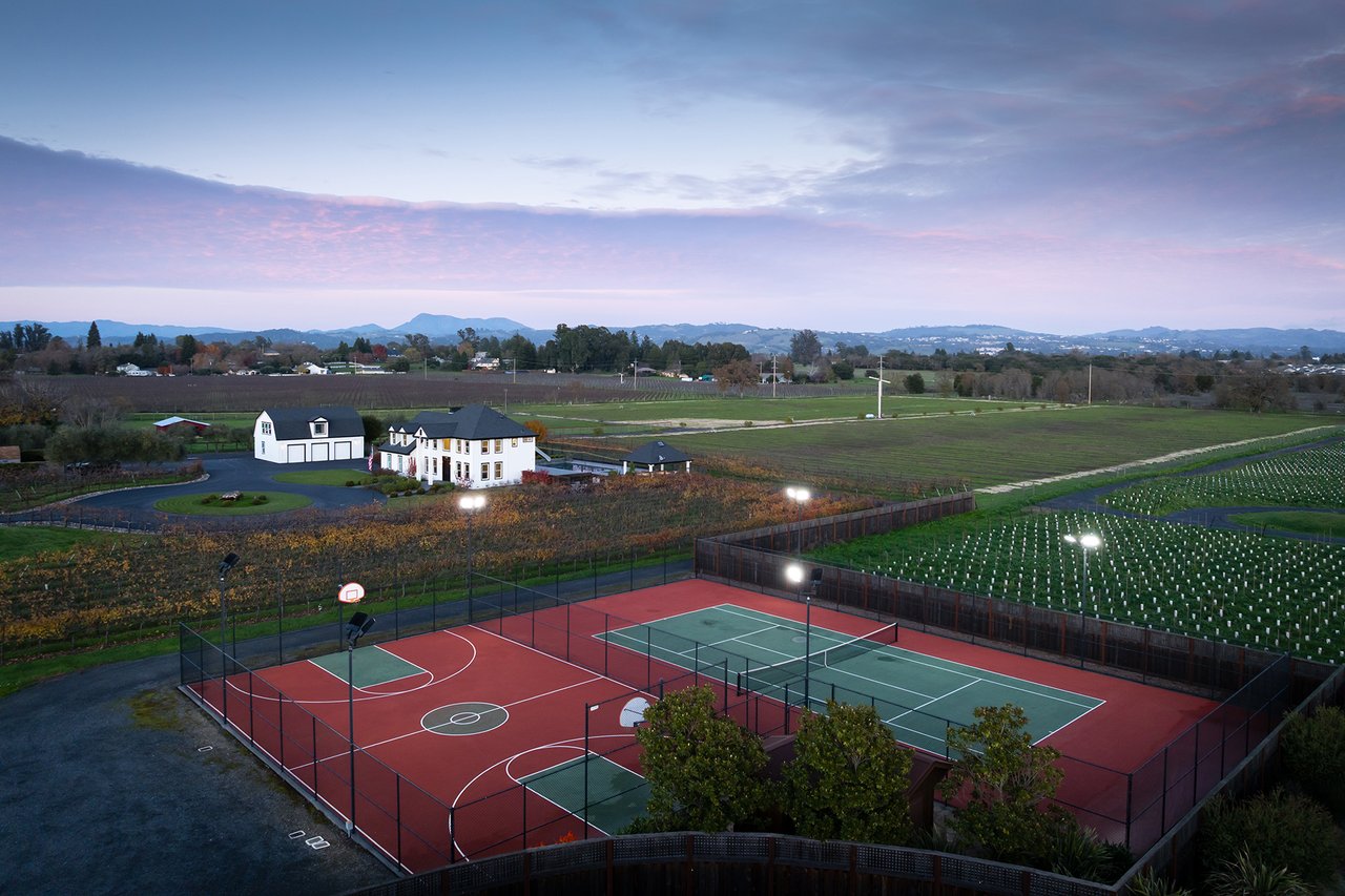 The main residence, remodeled in 2023, combines modern elegance with timeless warmth. It features light-filled living spaces, a chef’s kitchen with premium appliances, a home office, an elevator, and a personal salon. Additionally, there is a carriage house with a full kitchen and one bedroom and one bathroom above a three-car garage. Resort amenities include a pool with a waterslide, spa, and pergola with an outdoor kitchen. The property also boasts lighted tennis and basketball courts, as well as expansive patios with vineyard views, perfect for entertaining.